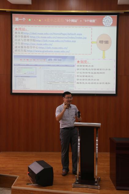 会议伊始,副院长朱建军详细解读了本科生教学培养方案,向学生们解读了校内与学生息息相关的六大网站、六大制度以及五大原则,通过对网站内容及功能的解读,对培养个性人才的平台介绍,对必修和选修课的选课方式讲解,以及对本科生导师制的推介,极大激发了新生在学习上的自律性以及积极性。