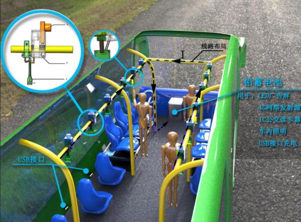 城市公交智能拉环节能装置是一个基于把拉力转化为电能的微型装置,能广泛应用于城市公共交通体系。其原理是当乘客借助拉手环保持自身平衡时,绳带带动电机转动会产生能量,再利用蓄电池以电能的形式储存能量,发电时利用了公交车拉手环中的固定件和拉环间的软绳带,装置配有自动回位装置,减少急刹车对人产生的安全问题。通过人的拉力转化为电力,为车上的广告灯箱等供电,装置配载USB接口,为乘客提供应急充电。