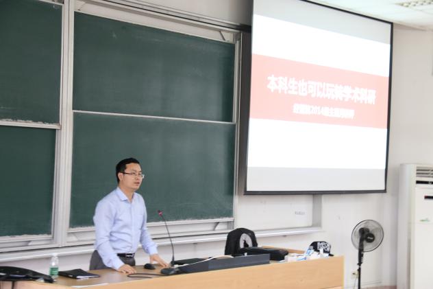 为激发体育投注平台 本科生参与学术科研的热情,提升求实精神、创新能力等素质能力,5月27日,体育投注平台 14级邀请教务处副处长朱建军、教务处实践培养科科长袁磊开展了“本科生也可以玩转学术科研”的主题宣讲会。