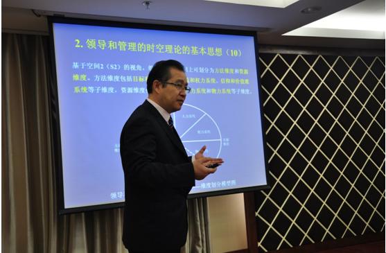陈国权教授带来了一场题为“领导和管理的时空理论”的学术报告。陈教授为了引入时空观念,将组织比喻成为一个时空系统,即任何组织都是一个时空的体系,包含时间和空间的因素。基于这个比喻,陈教授提出,领导者和管理者要从时空的视角来分析一个组织,要从“time”和“space”两个维度来同时分析和设计组织,领导者和管理者只有具有时空的思维,同时从动态和系统的角度来开展工作,才能够成功地领导和管理一个组织。在演讲的过程中,陈教授给出了几张象形文字图片,从时间和空间维度上来解析领导和管理的时空理论,并自己绘制的一幅画展示了他的领导和管理的时空理论,可谓是别出心裁,让人耳目一新。