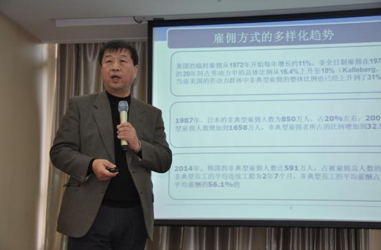 崔勋教授带来了关于“雇用方式多样化与人力资源管理”的学术报告。崔教授从典型雇佣和非典型雇佣角度引出雇佣方式多元化,重点剖析了非典型雇佣方式的选择动因、非典型雇佣方式的积极效果和消极效果、典型雇佣与非典型雇佣方式的互动效果、雇佣方式与人力资源管理的整合型、分离型、忽略型三种类型,以此为基础,从个体、群体、组织三个层面对雇用方式多样化的人力资源管理提出整体思考。