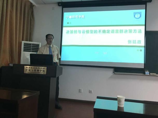 张廷政教授作了题为“决策树与云模型的不确定语言群决策方法”的报告,从概念、生成方法、概念合成等方面详细讲解了云模型,介绍了决策树与云模型的群决策方法,阐述如何将灰色系统理论与云模型有机结合,解决企业的实际案例。报告概念新颖,激发了在场老师和同学们的兴趣,展开了激烈的讨论。