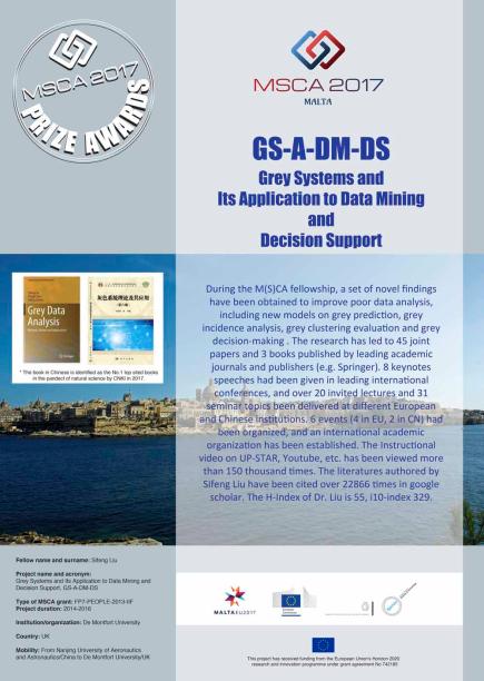 刘思峰教授获“10位最有为科学家奖”(10 shortlisted promising scientists in the MSCA 2017 Prizes),是欧盟居里夫人国际人才引进计划实施以来首位获奖的中国学者。