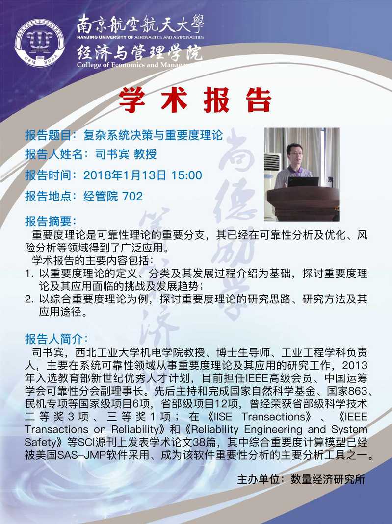 报告摘要:重要度理论是可靠性理论的重要分支,其已经在可靠性分析及优化、风险分析等领域得到了广泛应用。学术报告的主要内容包括:1. 以重要度理论的定义、分类及其发展过程介绍为基础,探讨重要度理论及其应用面临的挑战及发展趋势;2. 以综合重要度理论为例,探讨重要度理论的研究思路、研究方法及其应用途径。