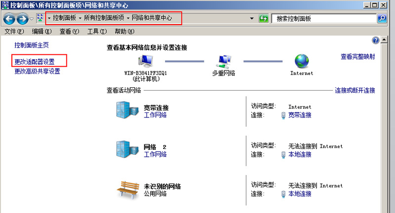 第一步:在“控制面板→网络和共享中心”中打开“更改适配器设置”,如下图所示: