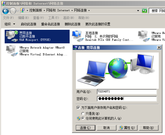 第三步:运行“宽带连接”,输入用户名和密码,用户名为学号,默认密码是身份证号码后六位,输入后点击连接即可上网。