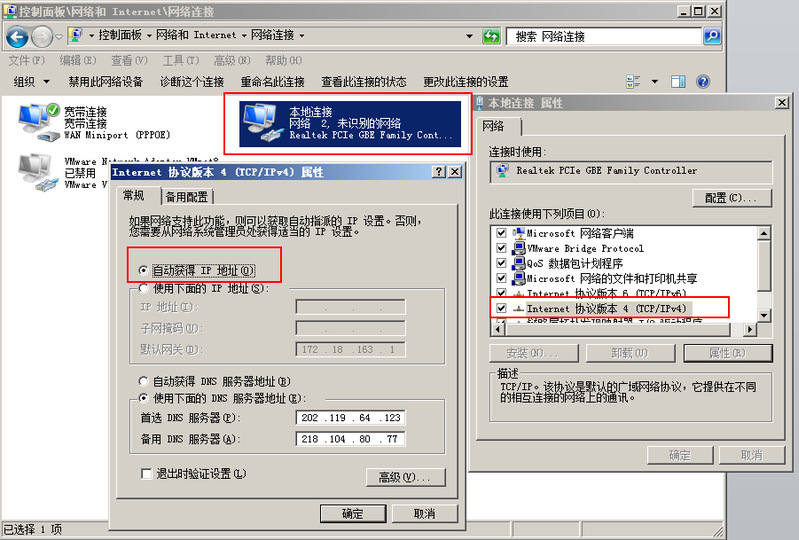 第二步:打开“本地连接”的属性窗口,选择“TCP/IPv4”属性,选取“自动获得IP地址”,确定即可,如下图所示;