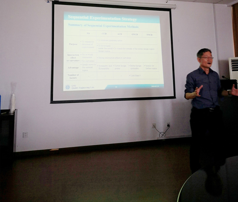 此次报告Jai-Hyun BYUN教授首先介绍了质量工程与稳健设计的基本概念,由此引出了序贯试验设计问题。Jai-Hyun BYUN教授根据初步析因设计的结果,分别采用最陡爬坡试验设计(Steepest Ascent,SA)、中心复合试验设计(Central Composite Design,CCD)、不对称复合试验设计(Asymmetric Composite Design,ACD)、重叠非中心复合试验设计(Overlapping Non-central Composite Design,ONCD)和非重叠非中心复合试验设计(Non-overlapping Non-central Composite Designs,NNCD)五种试验设计方法来展示各试验设计组合安排及数据分析;分别从设计点数和设计效率等几个角度对比分析了各试验设计方法的复杂度;给出了两阶段序贯试验设计的流程思路;并总结了五种试验设计方法优缺点和适用范围。报告期间,Jai-Hyun BYUN教授还跟在座博士生交流了如何做学术研究,并给博士生总结归纳了学术研究宝贵的经验,令在座师生获益匪浅。报告尾声,在座师生踊跃提问,积极交流,报告在热烈的掌声中圆满结束。