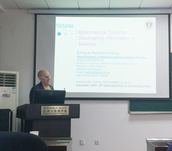 在学术交流活动中,Enrique Herera - Viedma教授首先向在场师生介绍了文献计量学,文献计量学是指用数学和统计学的方法,定量地分析一切知识载体的交叉科学。接着阐述了在文献计量学中,探索一个研究领域有两个主要的程序:绩效分析和科学知识图谱。绩效分析的目的是根据文献资料评价科学行动者(国家、大学、系、研究人员)及其活动的影响;科学知识图谱的目的是通过共词分析或文献共被引分析,展示科学研究的结构和动态方面,划定研究领域,对探测到的子领域进行量化和可视化。在这篇演讲中,教授展示了他在SECABA研究实验室开发的两个文献计量工具,一个是基于高被引论文的绩效分析的H-Classics开发,另一个是基于绩效文献计量指标的科学制图SciMAT开发。在报告结束之后,现场老师以及同学积极提问,教授耐心解答,与在场师生进行了深度交流。