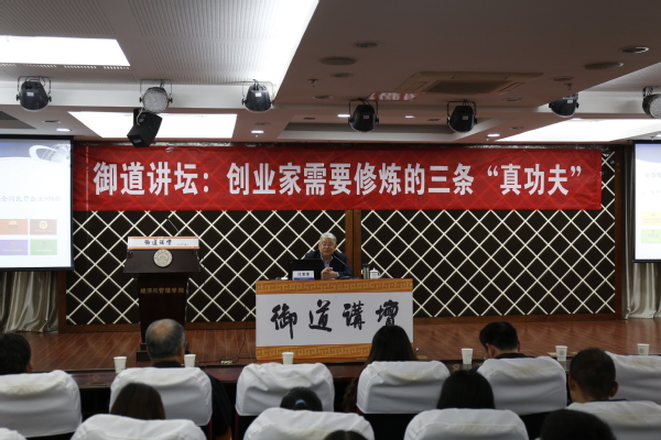 座谈结束后讲座正式开始,江宝全先生首先从“致创业者的信”入手纠正创业过程中的“十种负面情绪”,引导同学们树立正确的创业观念。随后,江先生围绕创业家需要修炼的三条“真功夫”,即吃苦吃怨吃冤的心理素质、打不垮摧不烂的坚强意志、善于审时度势的过硬本领,以自己30年前接手负债累累的金箔集团并将其发展成为年产值超过百亿的龙头企业的亲身经历,向同学们展示了由“创业者”成长为“企业家”过程中必不可少的重要素质和能力。