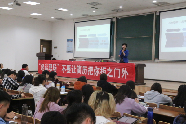 张进有20余年的资深HR从业经验,为上万名学生做过求职就业、职业规划方面的培训和辅导。张进首先从职业定位切入主题,以自己孩子的亲身经历,帮助同学们做好职业生涯规划,合理选择目标岗位。随后,她从简历制作和如何成功投递简历两个方面,以简历内容为重点,让同学们了解到简历的结构、格式、内容和制作简历的技巧和细节,为同学们带来了一堂内容丰富的培训课,帮助同学们认识到求职简历的重要性,提升简历制作的能力。