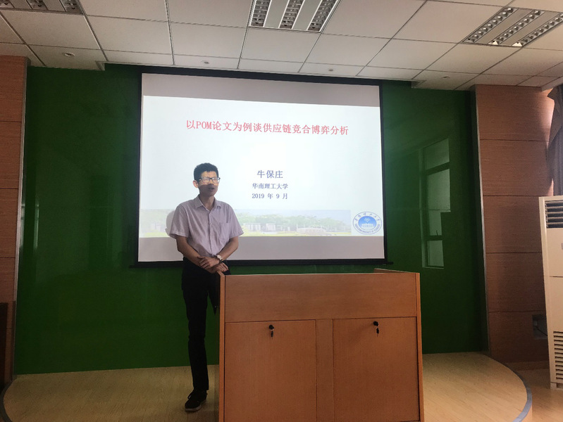 牛保庄以论文“Strategic Analysis of Dual Sourcing and Dual Channel with an Unreliable Alternative Supplier”的相关工作为基础,介绍了苹果和三星两家智能手机制造商之间的竞合关系,阐释了以此为背景的博弈模型构建的思路及其结构,并结合图示对模型求解结果进行了深入、细致的分析;接着,牛保庄简要分享了论文“Technology specifications and production timing in a co-opetitive supply chain”的相关研究,重点介绍了竞合供应链中相关主体的生产时间决策。在报告中,牛保庄以介绍的2篇POM为例,系统且生动地总结了高水平期刊的风格偏好和投稿注意事项。