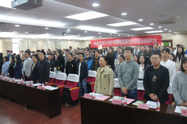 2019年10月30日中午,伴随着嘹亮的国歌声,体育投注平台 第四届学生党总支委员会换届选举大会在体育投注平台 A0305报告厅召开。体育投注平台 党委书记焦宏图、副书记涂志宏、组织员袁颖、新一届学生党总支委员会候选人和全体学生党员出席大会。大会由第三届学生党总支委员田苑娜主持。
