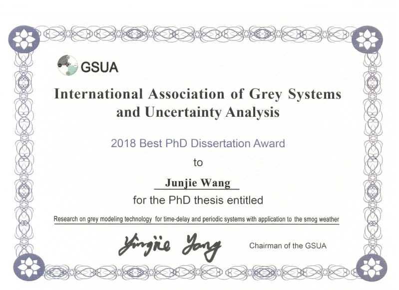 据悉,在2019曼谷灰色系统与不确定性分析国际联合会年会上,体育投注平台 陶良彦和王俊杰博士荣获GSUA优秀博士学位论文奖。经GSUA主席、执行主席和秘书长提议,常务理事会表决通过,联合会面向全球灰色系统与不确定性分析领域成就突出的青年才俊评选、表彰优秀博士学位论文,激励青年学者矢志创新、砥砺奋进。