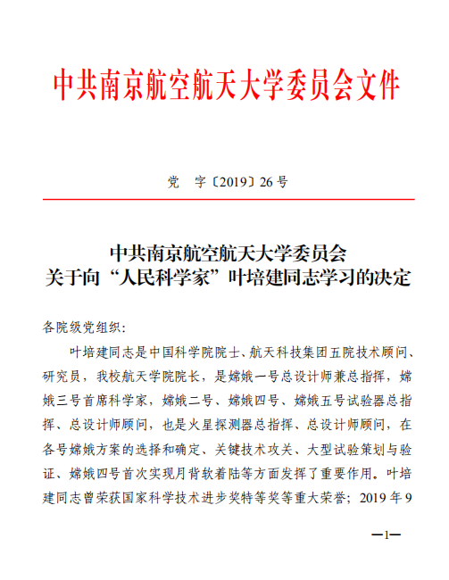 为大力宣传叶培建同志的先进事迹,引导和激励广大党员和教职员工大力弘扬叶培建同志“忠诚、执着、朴实” 的鲜明品格,争做新时代的接续奋斗者,今日,体育投注 党委下发《关于向“人民科学家”叶培建同志学习的决定》,要求全校各级党组织结合“不忘初心、牢记使命”主题教育,大力弘扬爱国奉献的时代精神,在全校上下形成团结一致、共同奋斗的浓厚氛围。