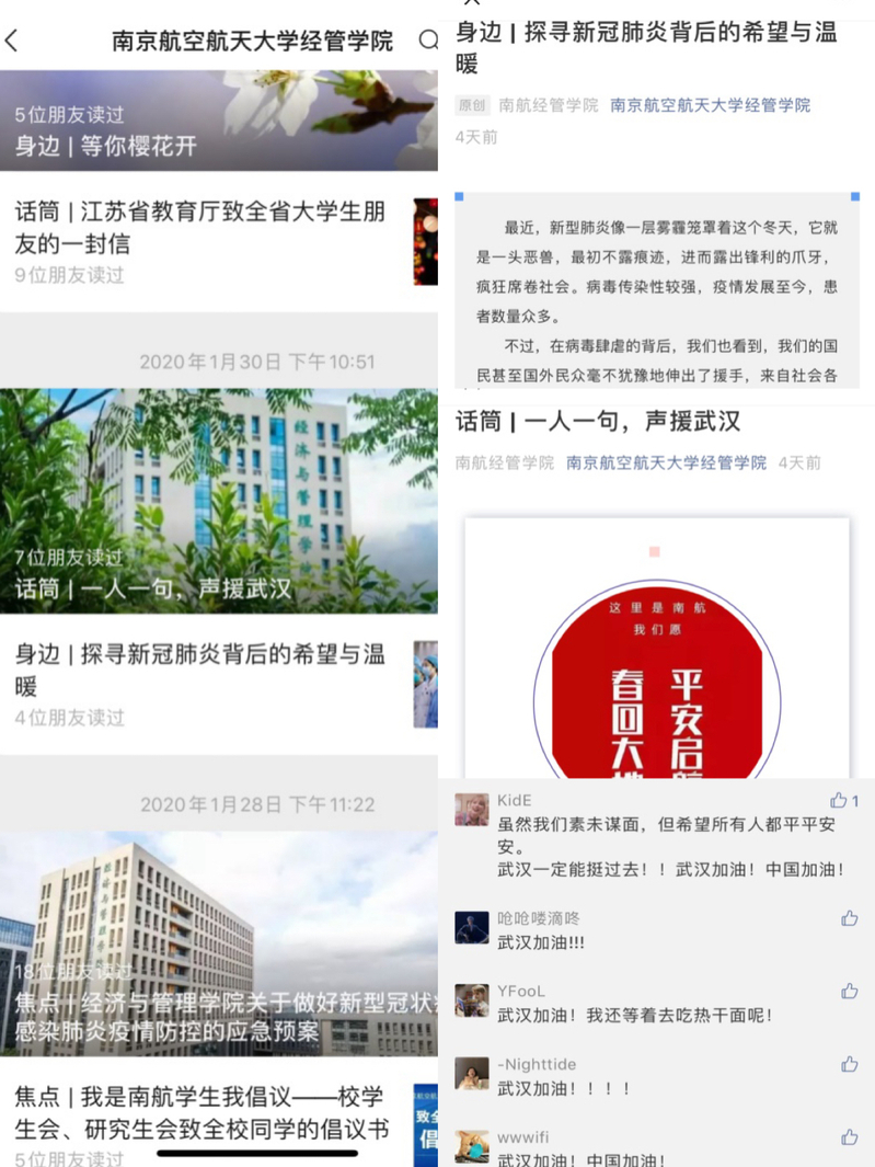 公众号开展“一人一句声援武汉”祝福众筹活动,发动全院师生为武汉加油,为身在武汉、身在湖北的师生加油!