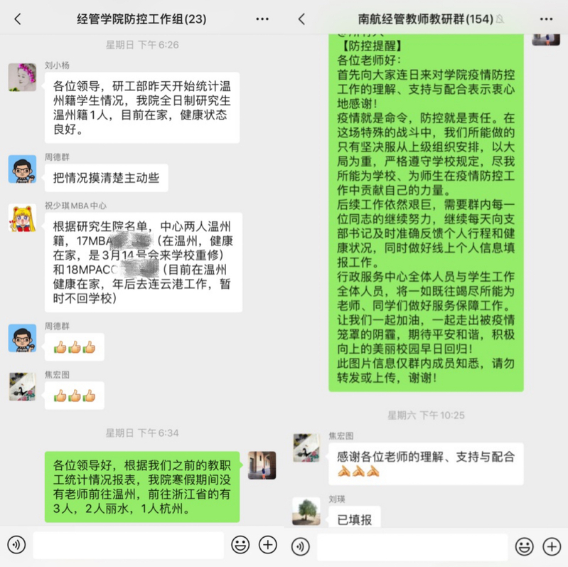 机关每日认真做好值班工作与信息统计上报工作,通过教工党支部与学生党支部对全体在职教职工和全体全日制学生及MBA中心住校学生进行跟踪排查,对全体离退休教师逐一关心询问,建立工作台账,细致排查师生在湖北等疫情高发地区的旅居情况,使“零报告”制度有准度;对与已感染、疑似感染人员密切接触或近期到过疫源地的学生密切关注,给予关心,对于本安排提前返校的师生做好疏导工作,让防控工作有温度。