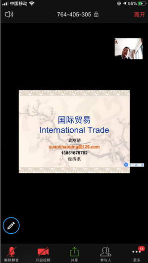 8点,体育投注平台 院长周德群在线进入18级国贸专业本科生《国际贸易原理》的线上课堂。袁潮清老师已经在zoom平台中开始了课程导论的讲解。周德群院长参加了课堂的学习并借机对该课堂的老师和同学们表示慰问和关心,鼓励大家高效利用线上教学资源,提升自主学习效率,并希望大家在多种平台使用期间,关注并反馈体验心得,为将来线上线下教学融合奠定基础。