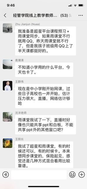 为了迎接2月24日体育投注平台 统一部署的线上学习,早在2周前,体育投注平台 组织教师及时收看各种教学平台的使用说明直播课,邀请经验丰富的教师发布平台使用心得及说明,老师们则在群内针对平台使用、学习方式选择进行了讨论和交流。老师们根据课程教学计划及具体授课的要求,在对超星、爱课程、雨课堂、腾讯课堂、zoom、welink等线上教学资源及会议工具进行对比后,选用适合自己的教学指导模式搭建课程平台,并提前建好课程班级线上交流群,开展试讲或模拟课堂等。考虑到可能出现的网络故障以及部分学生设备限制等问题,老师们同时还建立课程公共邮箱,提前上传了课程录播视频、教材资源以及作业任务等,以保证线上学习活动的正常开展。