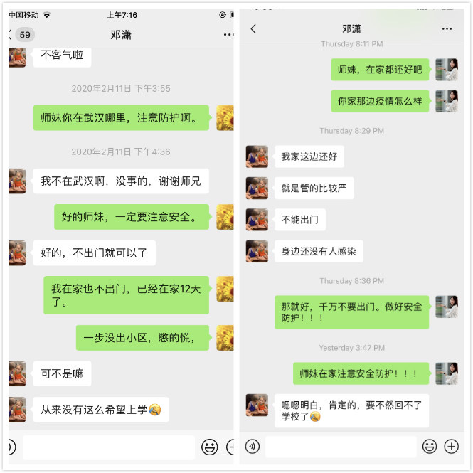面对这个特殊的寒假,在不能外出和返校的情况下,线上课题组群成为了团队成员交流学习的精神家园。导师徐海燕教授时刻关注、关心着学生们的身体状况和学习情况。在课题组群中,大家会第一时间收到徐海燕老师分享的最新疫情资讯、体育投注平台 和体育投注平台 的重要通知、科学防护指南。此外,他们还相互送去节日祝福和暖心问候。“隔离病毒,但不隔离爱”,家住湖北的邓潇同学是团队成员最为关心的对象。疫情爆发后,大家第一时间就与邓潇同学取得联系,表示关心与慰问。此后团队成员一直密切关注她的身体健康情况,了解其生活所需并及时给与帮助。