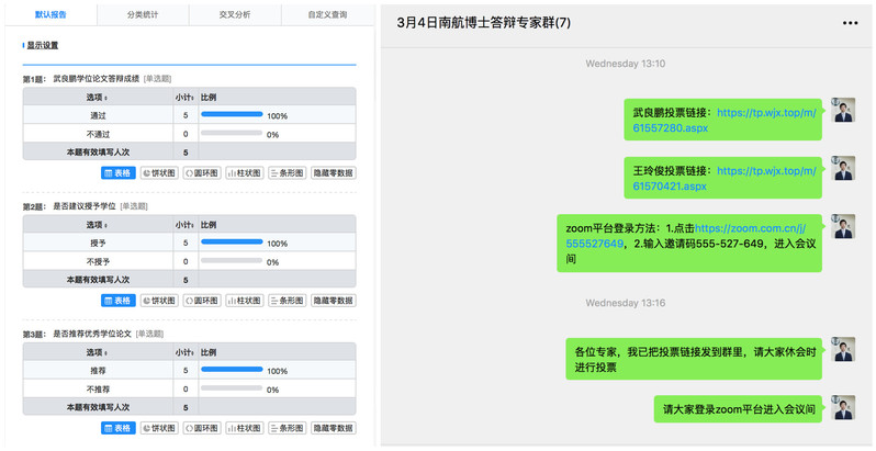 答辩过程中,按照体育投注平台 研究生学位论文答辩要求,两位学生通过论文内容陈述展示了研究成果,对答辩委员会成员的提问质询进行一一解答。答辩完成后经过答辩委员的线上讨论、投票表决,一致认为两位博士研究生的研究成果、学位论文和答辩过程达到了博士学位的要求,建议学位委员会授予博士学位。为了确保学位论文线上答辩的公开、真实、完整、使线上答辩有据可循。整个答辩过程,以及后续的匿名表决环节都做了录屏、截屏,作为答辩记录留存。