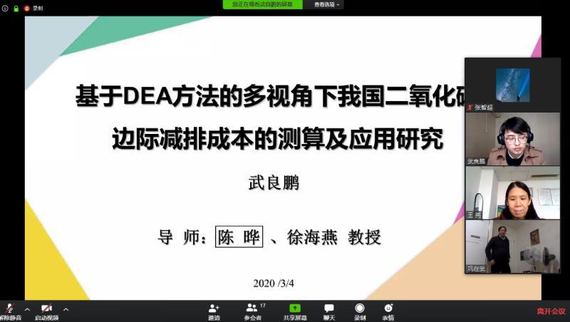 3月4日下午1点,答辩如期进行。本次答辩由答辩委员会主席、东南大学张玉林教授主持,南京信息工程大学巩在武教授,体育投注平台 王英教授、徐海燕教授、谢乃明教授、朱建军教授分别担任答辩委员会委员,何沙玮老师任秘书。在严格执行体育投注平台 博士毕业论文正式答辩标准的前提下,导师及其课题组、研究生院相关领导及体育投注平台 教学办工作人员等二十余人在线旁听了本次答辩,见证了体育投注平台 首次博士学位论文在线视频答辩的顺利完成。