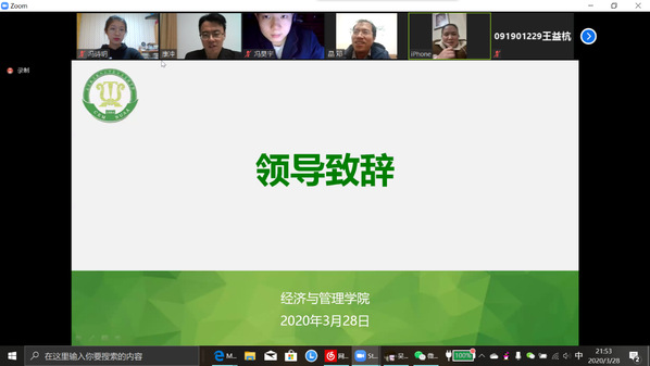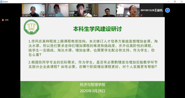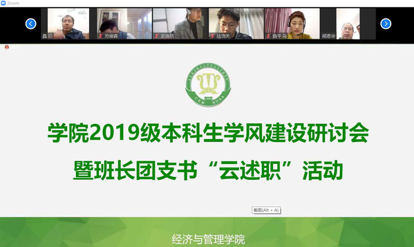 3月28日晚,体育投注平台 召开了2019级本科生学风建设研讨会暨班长团支书“云述职”会议。院党委副书记涂志宏、副院长邓晶、教学办主任田苑娜、团委书记刘小杨以及班主任代表韩梅、陆彪、肖琳、陈永洲、胡恩华、马晓平、王长波、苏飞、郝晓晴参加本次会议。会议由本科生2019级辅导员康冲主持。