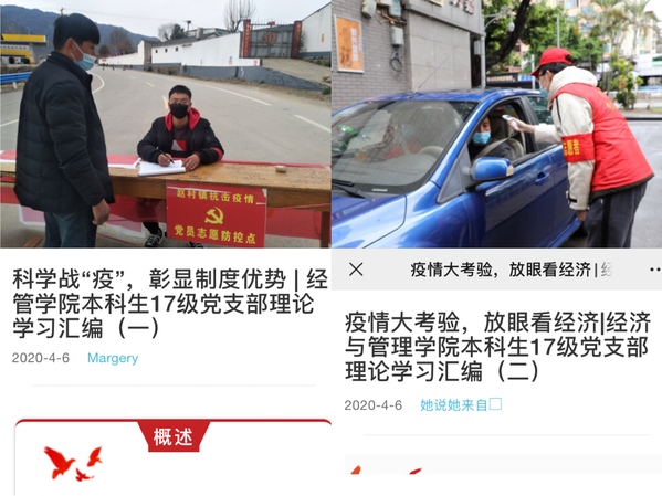 共抗疫情,爱国力行,不只是一句口号。17级党支部的成员们用实际行动参与到本次防疫行动中来。成立线上培训小组,结合疫情,编纂理论学习材料,效果显著;成立党员群众联络基地,党员与同学一对一,为开学后的防疫工作做好准备,确保同学们生活上、心理上的安全与稳定。