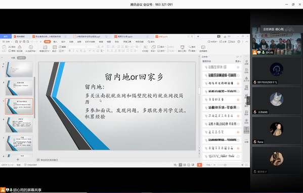 最后的职业生涯规划辅导中,玛依拉•赛依力老师指出,少数民族同学应充分利用在校期间的学习资源与活动资源,通过企事业单位见习等方式,提前了解就业形势,调整和改善个人就业准备,及早制定职业生涯规划。2017级辅导员胡心雨分析了当前大学生就业的相关政策,引导学生在加强专业知识学习之余,积极参与职业能力提升相关活动,增强求职竞争力,确定职业目标,增强求职自信心。