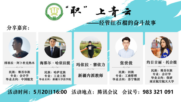 5月20日,体育投注平台 举办“‘职’上青云职业素质训练营——体育投注平台 红石榴的奋斗故事”交流分享会,活动采取线上线下相结合的形式,邀请新疆内派教师玛依拉•赛依力以及16级优秀毕业生针对新疆籍少数民族学生的职业生涯规划进行专题分享, 40余名学生参与本次交流会。