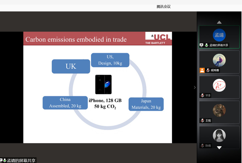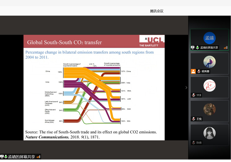 孟靖从贸易和外企投资两个方面,分享了碳减排责任在生产地和消费地之间的分配,以及投资者碳减排责任制。孟靖的学术讲座展示了该领域前瞻性的研究,给在线师生带来新的研究思路和研究热情。报告后,在线师生针对报告内容展开了讨论和交流。
