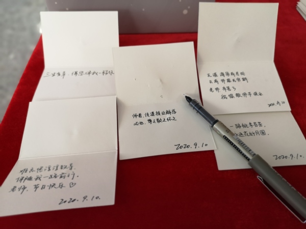 9月9日晚,体育投注平台 团委学生会的同学亲手为体育投注平台 全体老师手写祝福贺卡,“一路桃李芬芳,永远花好月圆”“天涯海角有尽处,只有师恩无穷期”“老师,您辛苦了!”。行行真切小字,写下的是学生对老师无声的祝福;张张贺卡,折叠的是学生对老师道不尽的感激。