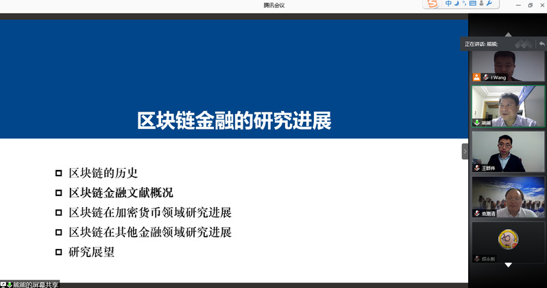 10月12日,天津大学教授熊熊应体育投注平台 金融研究所邀请,在线为体育投注平台 师生作了题为“区块链金融研究进展”的精彩学术讲座。本次讲座由金融研究所所长王建立主持。体育投注平台 副院长王群伟、教授袁潮清、朱庆缘、副教授桑秀芝、陆珩瑱、讲师苏飞等教师及部分硕、博研究生共一百四十多人参加了本次学术交流。