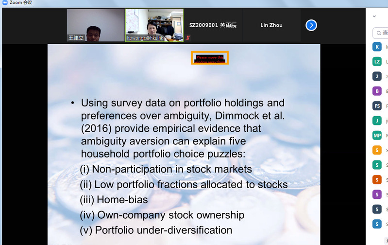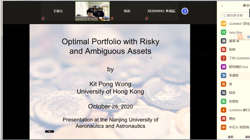 10月25日,香港大学教授Kit Pong Wong应体育投注平台 金融研究所邀请,在线上为体育投注平台 师生作了一场题为“Optimal Portfolios with Risky and Ambiguous Assets”的精彩学术讲座。讲座由金融研究所所长王建立主持。教授袁潮清、副教授桑秀芝、陆珩瑱、苏飞等教师及部分硕、博研究生参加了本次学术交流。