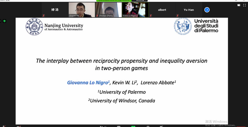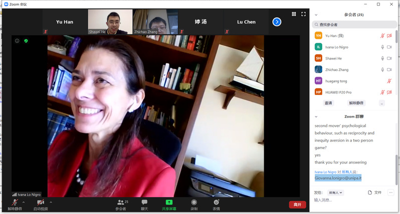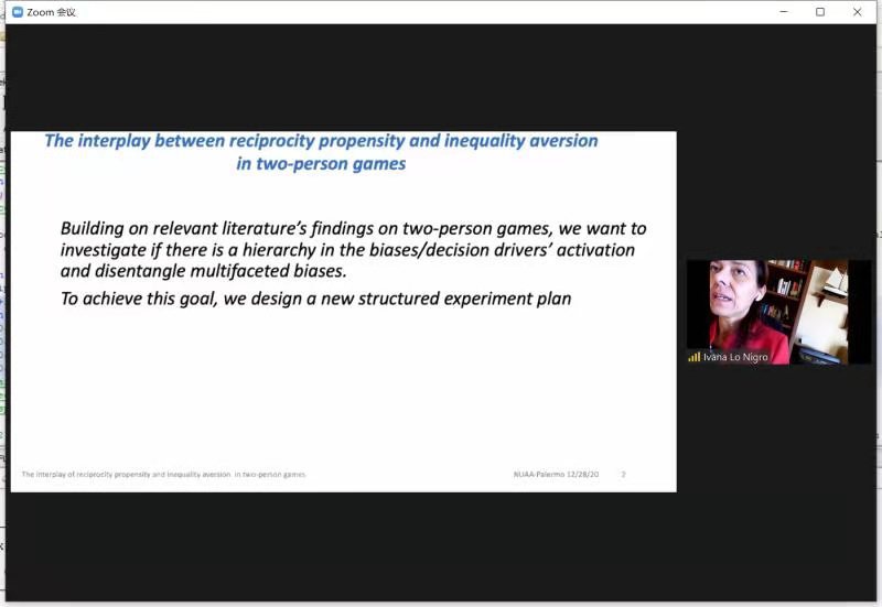 12月28日下午,意大利巴勒莫大学教授Giovanna Lo Nigro受体育投注平台 智能决策与风险分析研究所邀请,在ZOOM会议作了题为“The interplay of reciprocity propensity and inequality aversion in two-person games”的学术报告。体育投注平台 徐海燕教授、何沙玮副教授等教师及部分硕、博研究生线上参加了Giovanna Lo Nigro的报告分享,本次学术报告由何沙玮主持。