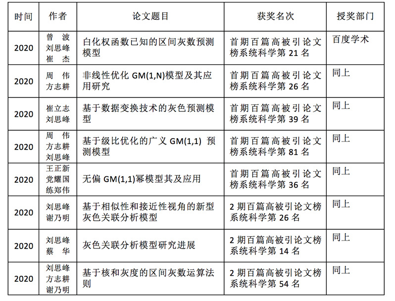 百度学术发布的引文报告,也包括各学科百篇高被引论文榜单,在系统科学学科首期和2期百篇高被引论文榜单中,灰色系统研究所共有8篇论文上榜。详见表1。