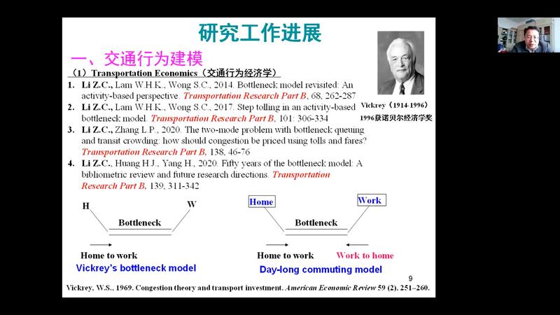 在此次学术交流活动中,李志纯作了题为“Research Progress in Transportation Economics”的报告。报告首先从交通行为建模、城市交通基础设施投资决策问题、交通需求管理(拥挤、排放税定价问题)、交通投资与城市经济、应急管理5个方面,介绍了交通运输经济学领域的研究进展。接着作了“Women-only parking spaces: Determinants of parking space choice, investment decision, and a case study of Wuhan, China”的研究分享。从问题背景、数据收集、影响停车时间的因素、影响女士停车位选择的因素、女士停车位与停车费优化以及案例研究、未来研究方向等作了详细的报告。