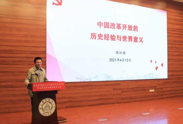 最后,校党史学习教育宣讲团成员陈红桂以“中国改革开放的历史经验与世界意义”为题,面向全体师生开展了党史学习教育专题培训。他从“反对历史虚伪主义、树立正确历史观”“改革开放史基本脉络及伟大成就”“中国改革开放成效的原因与经验”“改革开放的世界意义及其未来走向”四个方面开展强调了学习历史和树立正确党史观的重要性,勉励在座党员同学要更加坚定不移走中国特色社会主义道路。