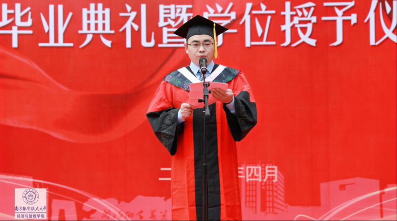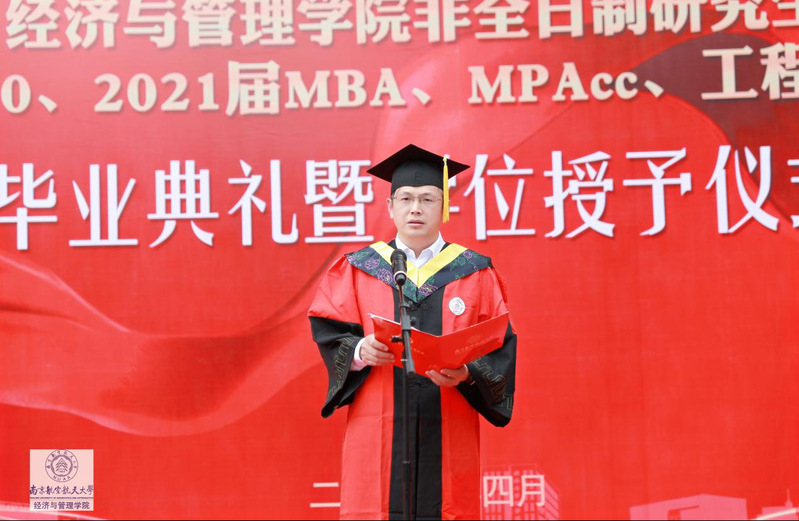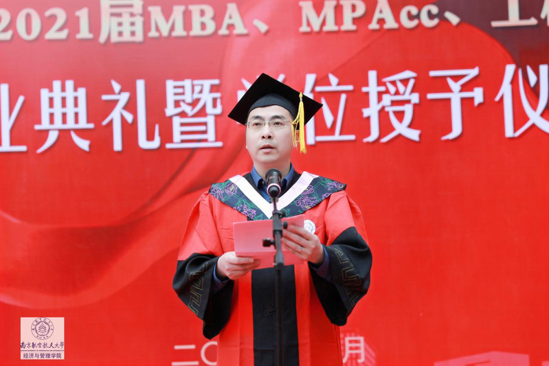 副院长王子龙教授宣读了学位评定委员会授予决定:授予胡其华等80位研究生工程硕士学位,授予厉波等190位研究生工商管理硕士学位,授予郑辛月等142位硕士研究生会计硕士学位。其中,杜兴敏等46名毕业生荣获MBA优秀毕业生荣誉称号;朱啸天等31名毕业生荣获MPAcc优秀毕业生荣誉称号;张希萌等2名毕业生荣获工程硕士优秀毕业生荣誉称号。