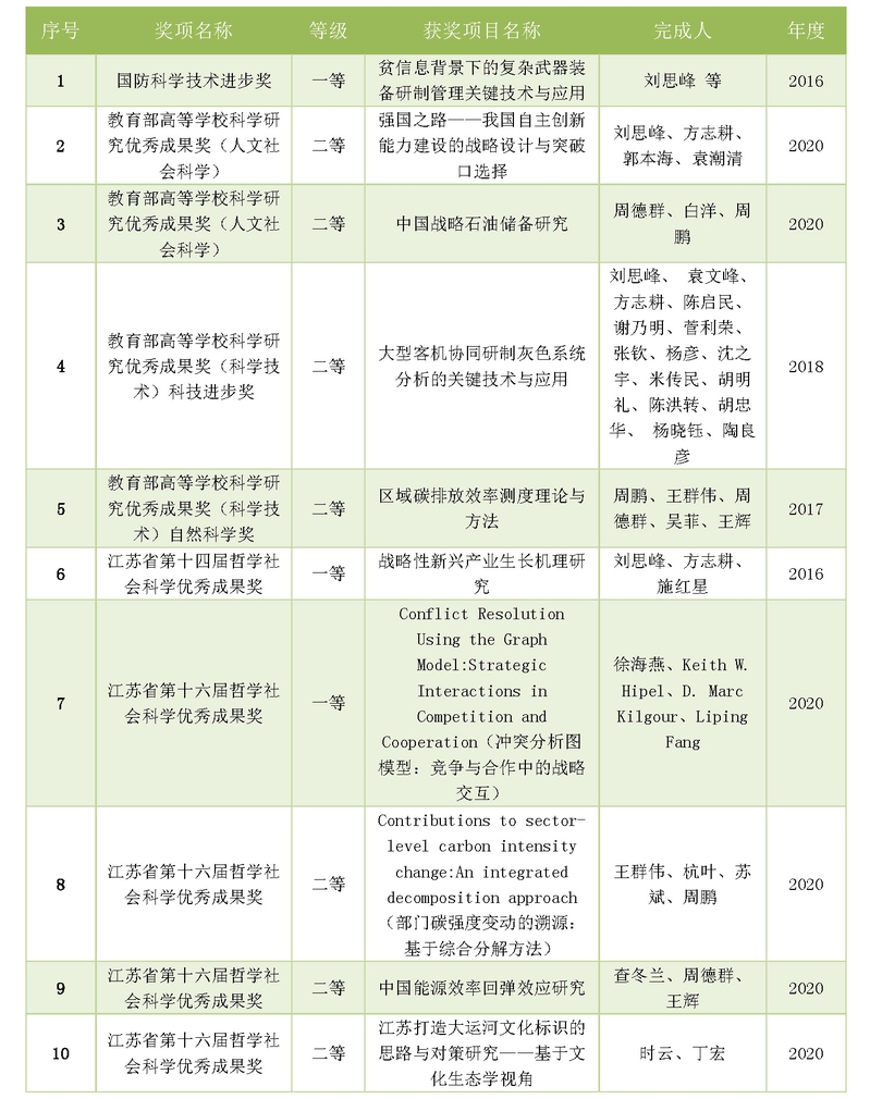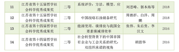 ——聚焦前沿,构筑高地。建设现代能源体系和加快改善生态环境是十三五规划的重要内容。周德群教授团队聚焦能源经济环境系统分析前沿,深入解析中国生态文明建设进程中的核心科学问题,在能源与环境效率评价方向入选2016经济学、心理学与其它社会科学全球十大热点前沿TOP1贡献机构。在冲突分析、群决策、服务科学等方向主办INFORMS 系列高层次学术会议,搭建学科交流平台,打造学术研究高地,推动学科前沿面的交流。相关成果获教育部人文社科、自然科学二等奖、江苏省哲学社会科学优秀成果一等奖。