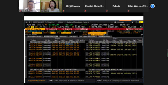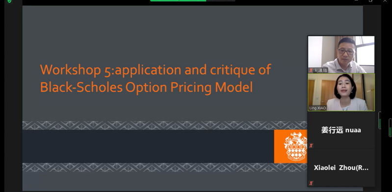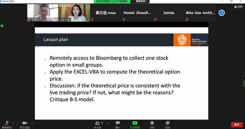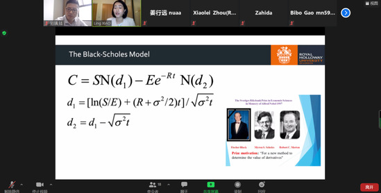 体育投注平台 经济管理体育投注平台 8位硕士研究生与伦敦大学皇家霍洛威体育投注平台 10位硕士研究一起进入线上课堂。教学活动按照中英两个小组,使用Bloomberg实时股票价格数据和期权数据验证B-S模型,通过实时计算的期权价值与实际交易的期权价格进行比较,深入讨论二者的差异原因。