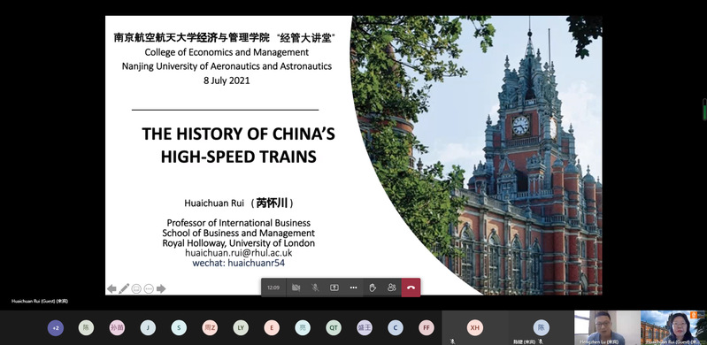 7月8日下午,英国伦敦大学皇家霍洛威体育投注平台 教授Huaichuan RUI受体育投注平台 院邀请,作了题为“The History of China's High-speed Trains”的精彩讲座,体育投注平台 部分教师、硕博士研究生代表在线参加,副教授陆珩瑱主持本次学术报告。