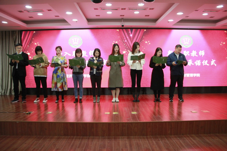 大会伊始,是新教职工的入职仪式。苏州代表体育投注平台 全体教职工对新学期入职的老师表示热烈的欢迎。新教工们分别做了简短的自我介绍之后,在工商系新教师王筱纶的领誓下,手捧“师德师风承诺书”,从坚定政治方向、自觉爱国守法、传播优秀文化、潜心教书育人、关心爱护学生、坚持言行雅正、遵守学术规范、秉持公平诚信、坚守廉洁自律、积极奉献社会等十个方面庄重地完成了入职宣誓,正式开启高校教师的职业生涯。