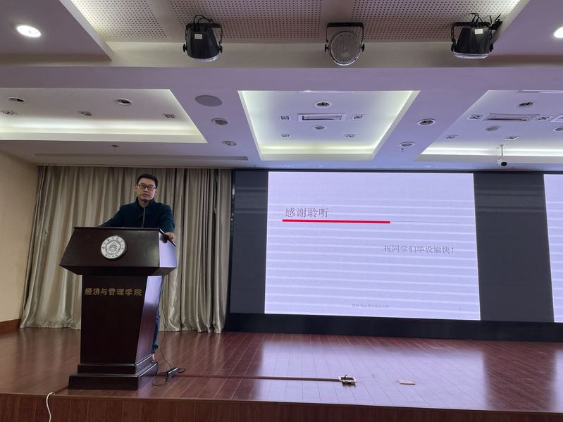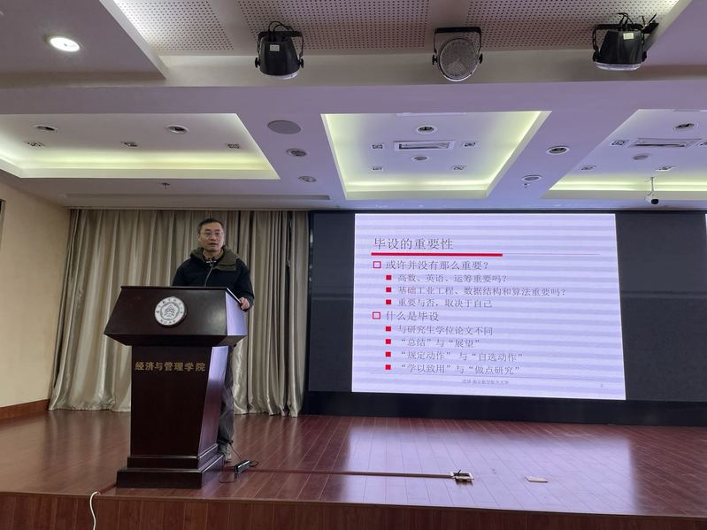 何沙玮老师在会议的开场介绍了今年毕设工作的基本情况。针对管理科学与工程系的师生数量比例,说明了今年系里新施行的毕设指导政策,同时呼吁指导老师关注往年存在的较为普遍的问题。面对大四同学,鼓励大家积极主动联系导师,按时、高质量地完成本科毕设流程中各时间节点规定的任务。