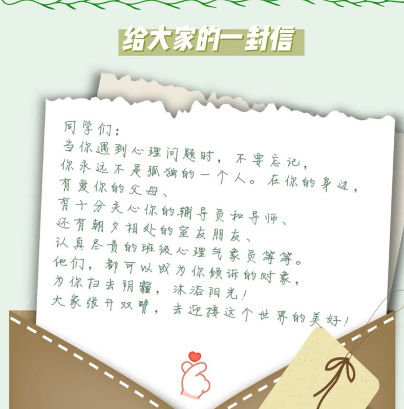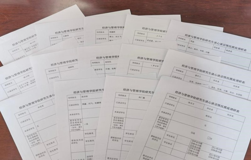 体育投注平台 领导采用多种形式与学生开展对话,通过探访学生宿舍、走访研究生工作室的方式,贴近学生的科研生活,了解学生的工作动向;采用给学生过生日的形式拉近与学生的距离,关心学生的真实需求。同时,导师是研究生培养的第一责任人,体育投注平台 老师与学生定期交流并形成谈心谈话情况摸底表,了解学生内心想法并及时做好引导工作。辅导员作为学生健康生活的知心朋友,充分掌握学生的最新动向,结合心理问卷调查结果和学生谈心谈话摸底表,点对点地开展谈心谈话工作,做好学生心理健康的后续反馈和问题疏导工作。多方力量相互配合、共同努力,充分关注学生心理健康,做好学生心理预警工作。