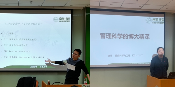 在开营第一讲中,刘思峰老师以“我的科研之路”为主题与同学们分享了自己走上科研之路的契机,真挚地向同学们传递了科研本身的乐趣与享受。在接下来的专题培训中,何沙玮老师借“站在巨人的肩膀上”与“套娃理论”的隐喻,生动地阐明了“一流的科研需要一流的学术信息”这一重要科研素养;张晓恒老师围绕“学术小白如何读论文、写论文”进行细致解答,强调了积累、方法以及信心是科研道路上最不可或缺的要素;何昌清老师联系自身经历,建议同学们尽早规划职业生涯,并就主题“管理学实证研究方法”展开指导;2018级博士研究生谭笑就“管理科学的博大精深”主题发表了自己的心得体会,并通过列举生活实例、引用专业术语等途径,使内容达到学术性与引导性的高度统一。
