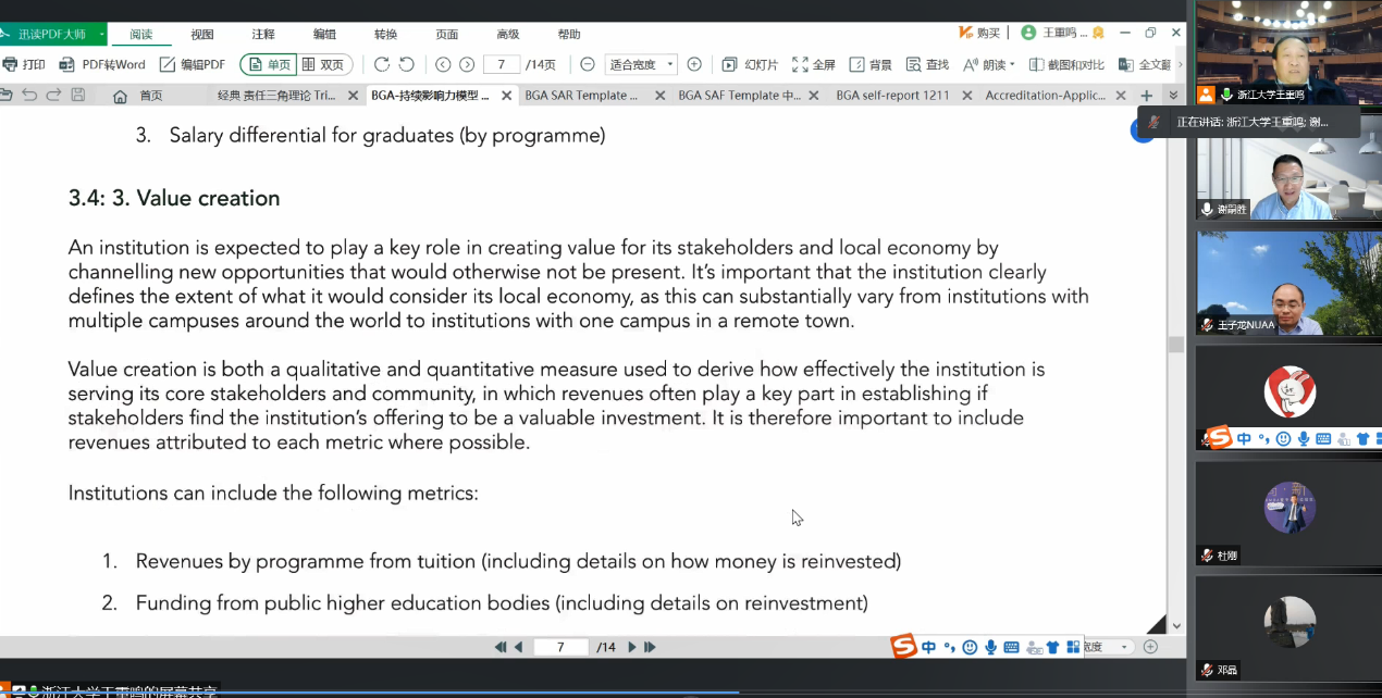12月21日晚,国际工商管理认证协会(AMBA)中国区总负责人、浙江大学文科资深教授、浙江大学全球创业研究中心主任王重鸣教授应邀指导体育投注平台 BGA认证工作。因疫情防控需要,本次会议在线上召开。体育投注平台 院长周德群、党委书记苏州、体育投注平台 副院长王子龙、邓晶、谢乃明、院长助理兼认证中心主任谢嗣胜、MBA教育中心执行主任杜刚以及相关专业老师参加会议。