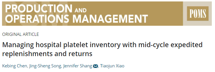 近期,体育投注平台 陈克兵教授作为第一作者的研究成果《Managing hospital platelet inventory with mid-cycle expedited replenishments and returns》在UTD24国际顶级期刊《Production and Operations Management》在线发表,实现了体育投注平台 教师在该类国际顶级期刊成果发表的突破。研究成果由体育投注平台 陈克兵教授、美国杜克大学商体育投注平台 Jing-Sheng Song教授、美国匹兹堡大学Katz商体育投注平台 Jennifer Shang教授、南京大学工程管理体育投注平台 肖条军教授合作完成。