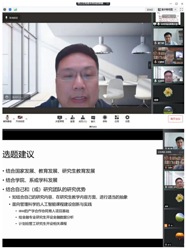 5月6日,体育投注平台 开展了“研究生教育教学高质量发展研讨月”线上活动,邀请人事处副处长王群伟教授、管理科学与工程系主任米传民教授作为主讲人,分享了教学改革研究项目申报与完成的相关经验。体育投注平台 副院长谢乃明教授、近40位青年教师代表及教学办相关人员共同参与了此次活动。