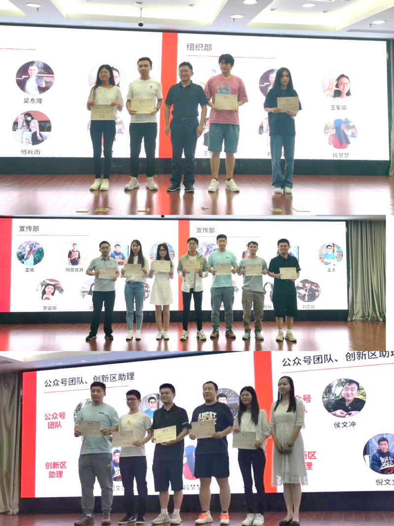 会议最后,周德群、王群伟、查冬兰为中心新成立的组织部、宣传部,以及公众号团队、创新区助理团队颁发了聘书。